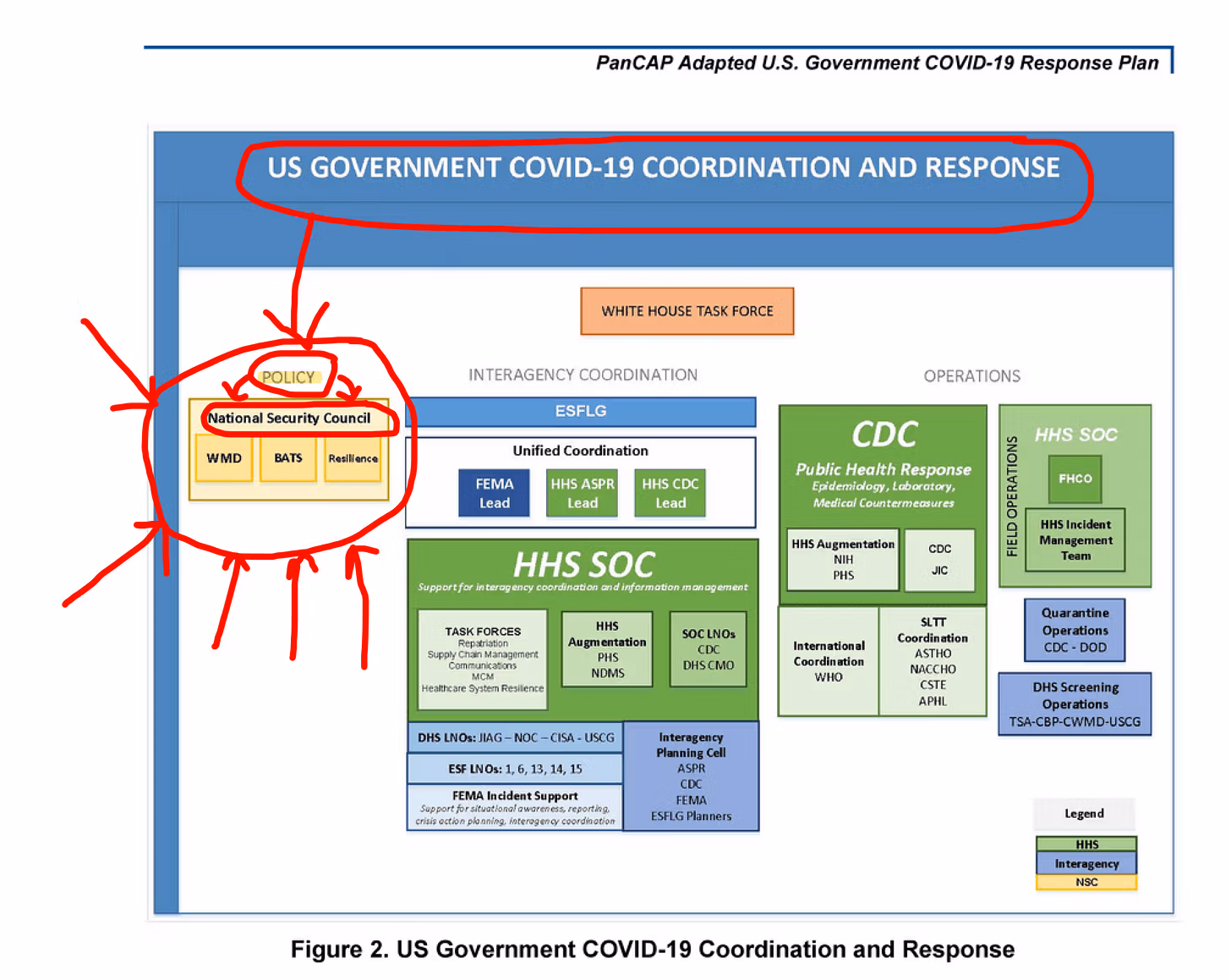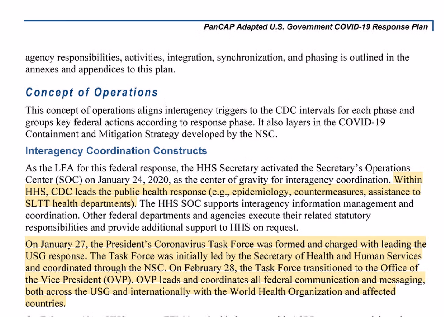 በዩኤስ መንግሥት የኮቪድ-19 ምላሽ ዕቅድ መሠረት፣ ከየካቲት 28 ቀን 2020 ጀምሮ ስለ ወረርሽኙ “ሁሉም የፌዴራል ግንኙነቶች እና የመልእክት መላኪያዎች” በብሔራዊ የደኅንነት ምክር ቤት የሚመራውን ግብረ ኃይል ባቋቋመው በምክትል ፕሬዝዳንት ጽሕፈት ቤት በኩል ማለፍ ነበረባቸው።
