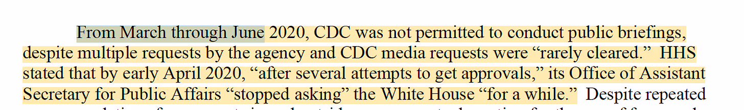 ምንም እንኳ የመሪነት ሚና መጫወት ነበረበት ከየካቲት 28 ቀን 2020 ጀምሮ በወረርሽኙ ግንኙነቶች ውስጥ ሲዲሲ በእውነቱ “ሕዝባዊ መግለጫዎችን እንዲያደርግ አልተፈቀደለትም” ሲል ነበር ። ሴኔት ሪፖርት.