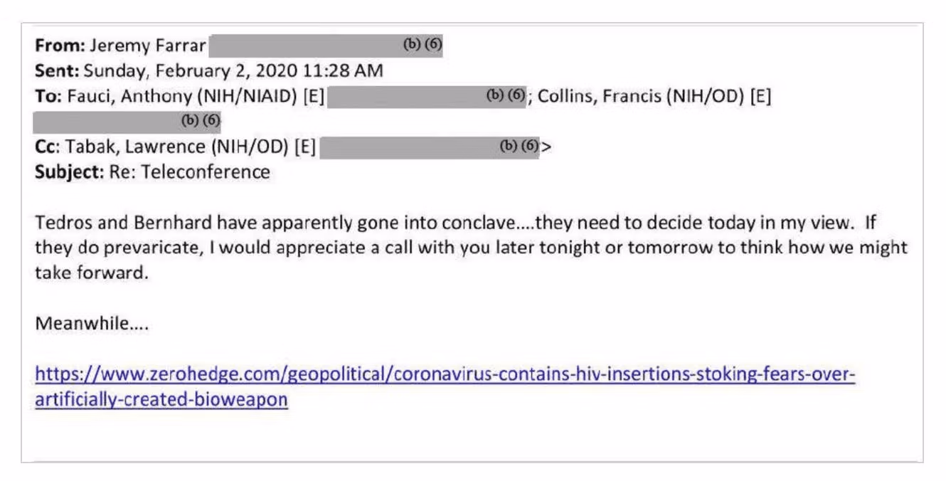 ፋራራ የዜሮ ሄጅ መጣጥፍን ጠቁሟል [አሁን በማህደር ተቀምጧል] ለፋውቺ እና ለኮሊንስ በተላከ ኢሜል የቫይረስ=ባዮዌፖን እድል ከፍ ያደርገዋል። በኢሜል ውስጥ የዓለም ጤና ድርጅት መሪዎች አንድ አስፈላጊ ውሳኔ ለማድረግ በሂደት ላይ መሆናቸውን ጠቅሷል. ምናልባት “ቅድመ-ሁኔታ” ማለትም “እውነትን ከመናገር መቆጠብ” ማለት እንደሆነ ተናግሯል።